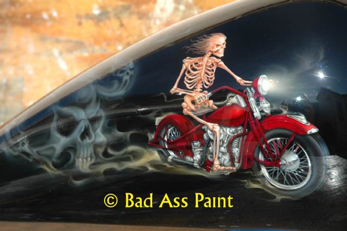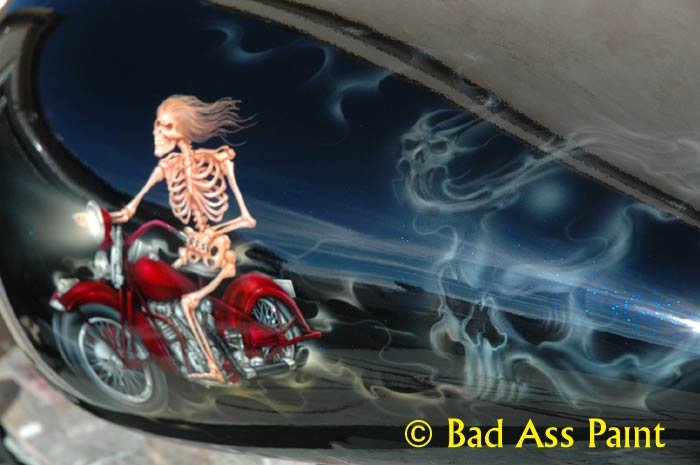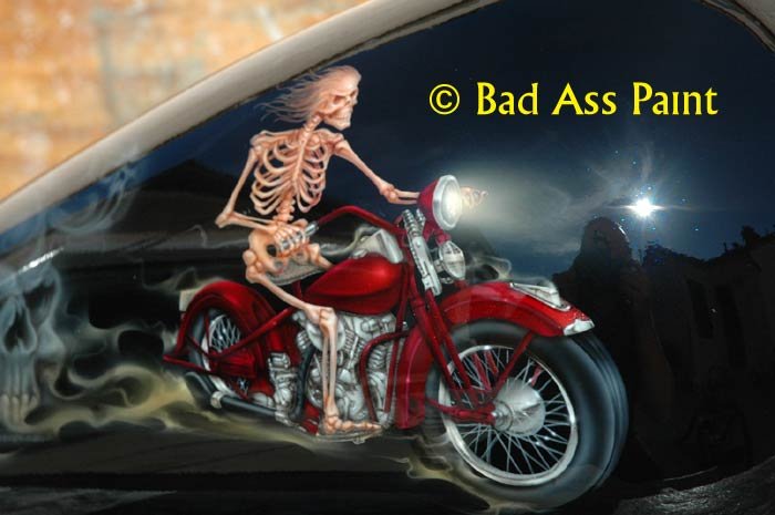 Renae from Honolulu, Hawaii asked for a skeleton riding a motorcycle for his fantasy design. The skeleton has nothing but hair on him as he rides into the night. Call Bad Ass Paint at 1-310-594-6730 for custom airbrush painted fantasy designs.