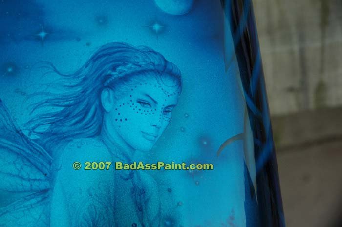 Fantasy designs include mythical creatures such as dragons, unicorns, pegasus, griffins, centaurs, elves, faeries, pixies, angels, witches, demons, devils and more. Fantasy art can also show real people and animals in a fantasy. Sexy women are popular designs for motorcycles and automobiles. Call Bad Ass Paint at 1-310-594-6730 for custom airbrush painted fantasy designs.