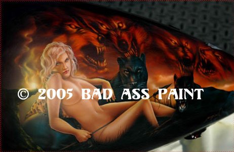 Many male fantasies include beautiful women, especially sexy nude women. Imagine your fantasy female with long, silky hair, ruby red lips, sparkling eyes and sensuous curves. Your chopper would be a show-stopper with these erotic fantasy designs. Call Bad Ass Paint at 1-310-594-6730 for custom airbrush painted fantasy art work.