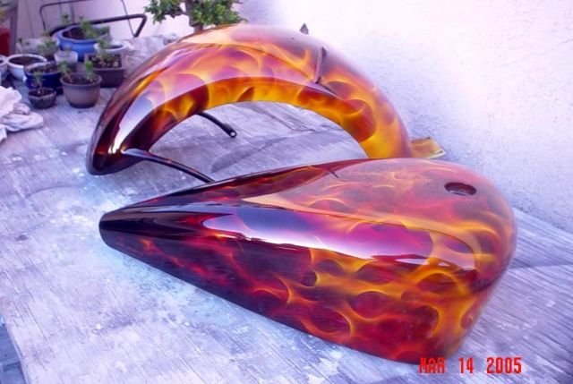 Choose from our flaming design or your own and in any color scheme you desire. Nothing looks hotter than fire! Call Bad Ass Paint at 1-310-594-6730 for custom airbrush paint work for your motorcycle, automobile or other metal or fiberglass items.