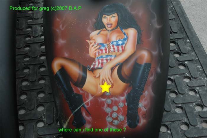 Sexy pin ups, fantasy women, female vampires, gothic girls and naughty nymphs make any man's motorcycle a fun ride. Choose from blondes, brunettes, red heads or any hair color. Choose any image in any fantasy and that image can be digitally rendered, then painted on your motorcycle. Your bike will be the envy of all of your friends.
