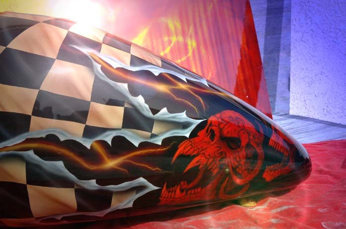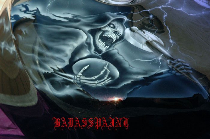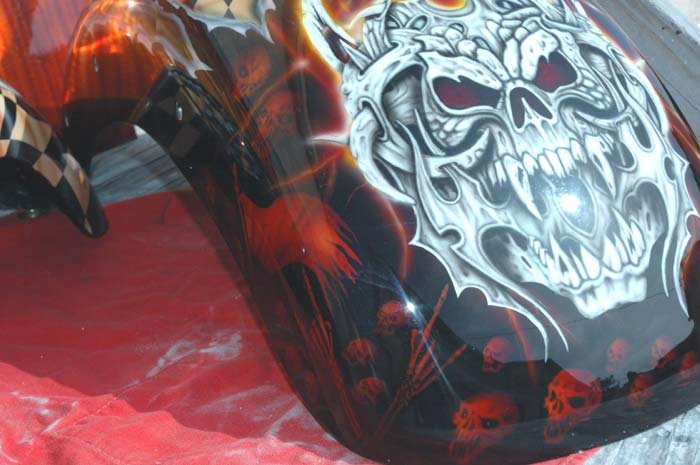 Skulls, skeletons, cross bones and the Grim Reaper are popular designs for motorcycles. The bikers who choose such designs are wild hellraisers who are not afraid to flirt with death. The fearsome, intimidating designs add character and style. This particular skull on the fender is popular with Motorhead rock and roll fans. Call Bad Ass Paint at 1-310-594-6730 for custom airbrush paint work for your motorcycle, automobile or other metal or fiberglass items.
